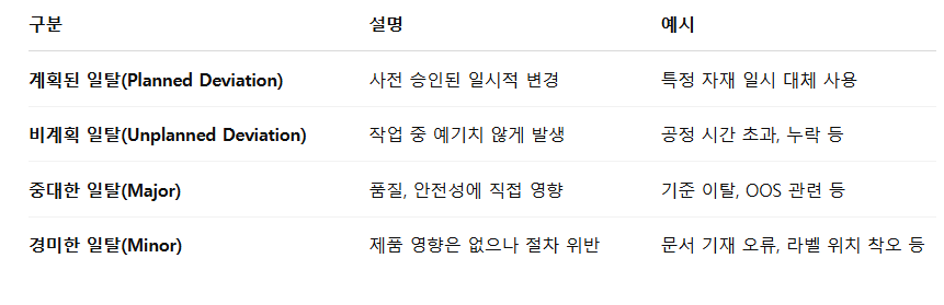 일탈이란, 정해진 절차(SOP), 기준, 규격 등에서 벗어난 모든 행위 또는 상황을 말합니다.