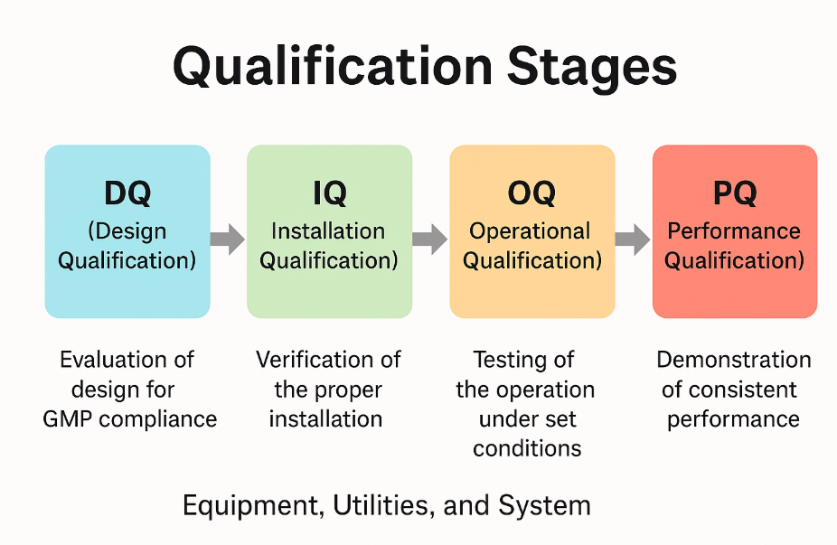 적격성 평가는 설비, 유틸리티, 시스템이 GMP 기준에 따라 제대로 작동하는지 단계적으로 확인하는 절차입니다.