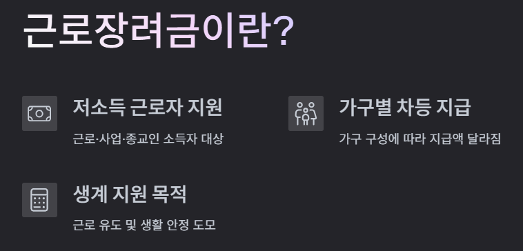 가구 구성과 소득에 따라 장려금을 지급해 근로를 유도하고 생계를 지원하는 제도입니다.