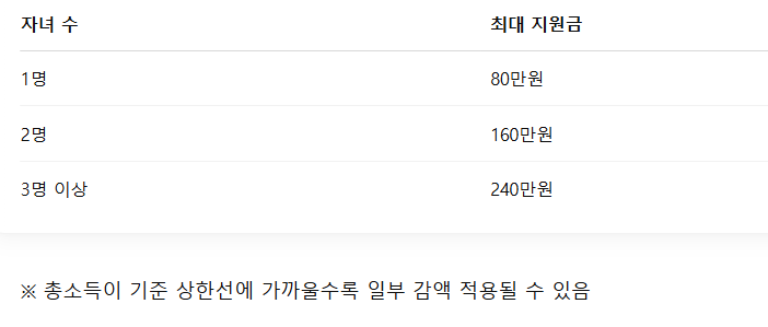 18세 미만 자녀가 있는 저소득 가구라면, 1인당 최대 80만원까지 지원받을 수 있는데요.