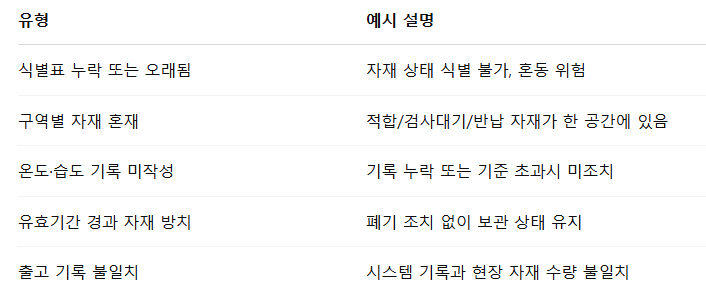 자재는 용도와 상태에 따라 물리적 또는 시각적으로 명확히 구분된 공간에서 보관해야 하며,