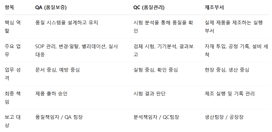 1. QA / QC / 제조 – 핵심 차이 요약표